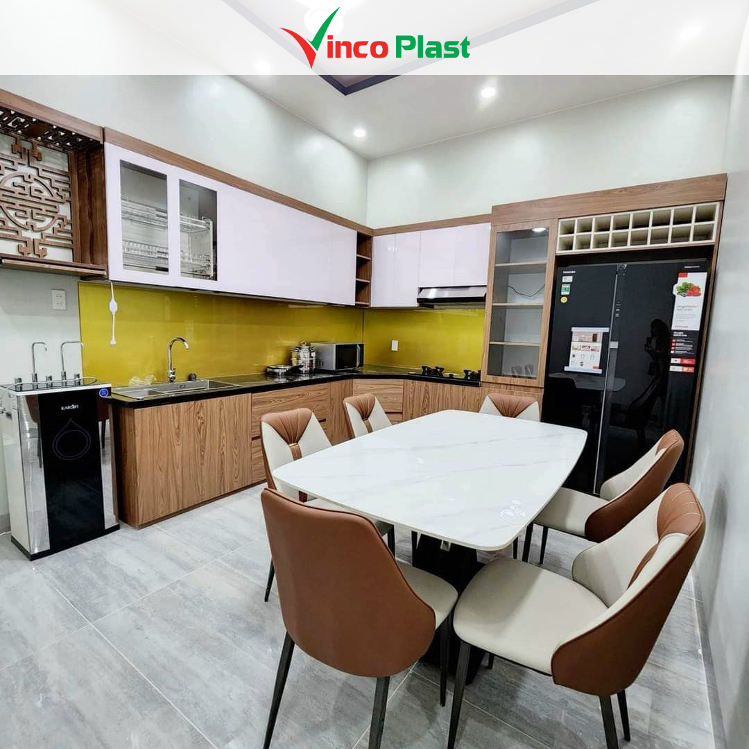 Do tính chất không hấp thụ nước, không mục mốc, nhựa Vinco có thể giữ form và độ bền theo năm tháng – điều mà nhiều khách hàng ưu tiên khi làm tủ bếp.